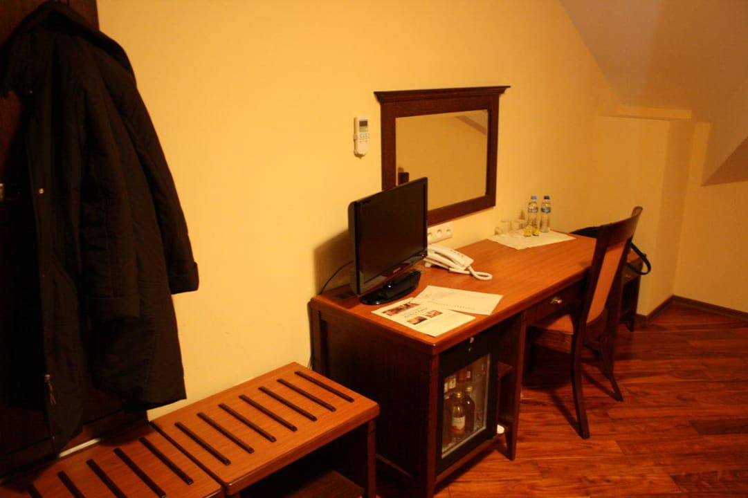 Schreibtisch mit Stuhl und Minibar, daneben Ablagefläche für einen Koffer