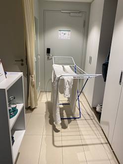 Wäscheständer im Zimmer - irgendwie mussten ja sie Sachen auch ohne funktionierende Badheizung trocknen (Trocknen auf dem Balkon war wegen Wind und Regen nicht möglich)