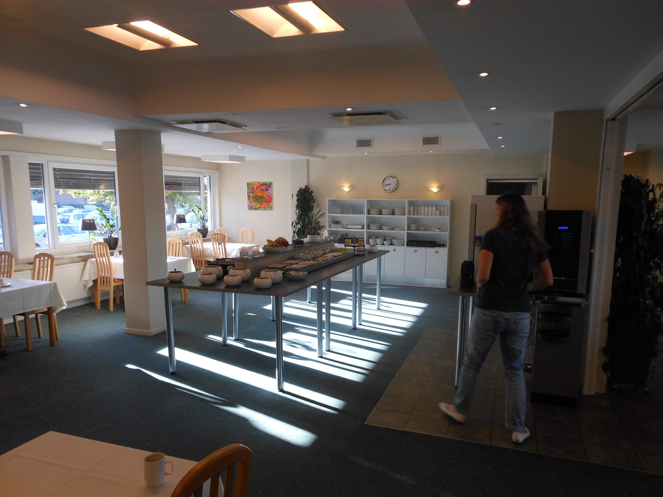 Das Bild zeigt einen Teil des Frühstücksraums mit dem aufgebauten Buffet. Es wird laufend aufgefüllt. Der Kaffee ist am Automaten erhältlich, Jogurth und Milch ist im Kühlschrank.