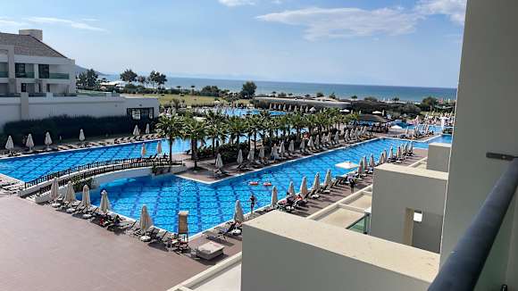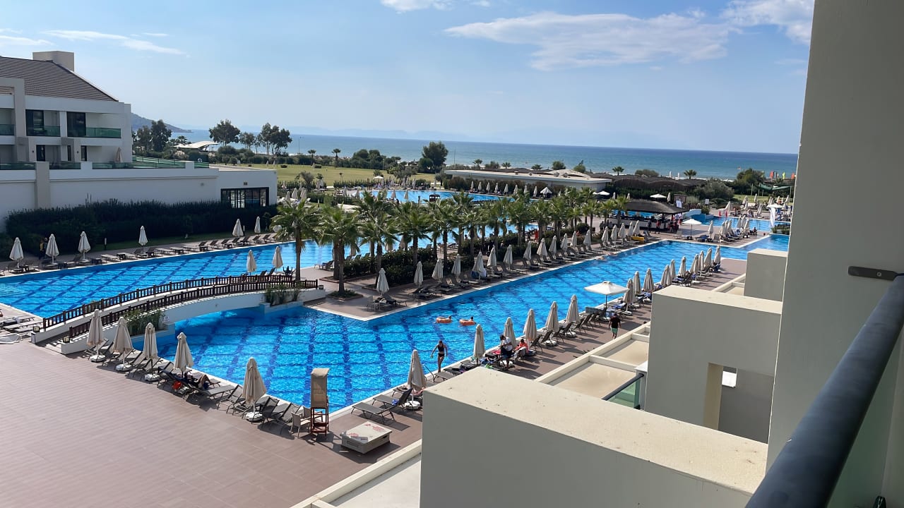 Blick vom Balkon auf den Pool und das Meer