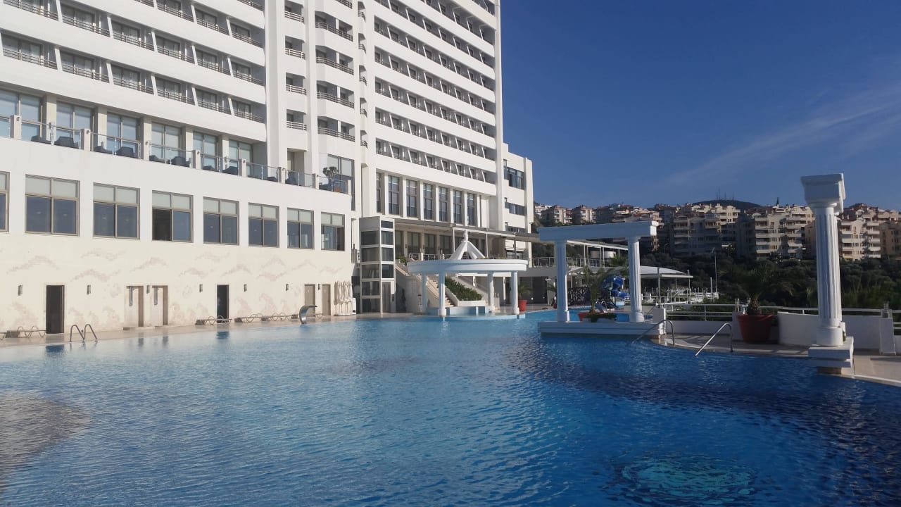 Poolblick mit Hotel im Hintergrund