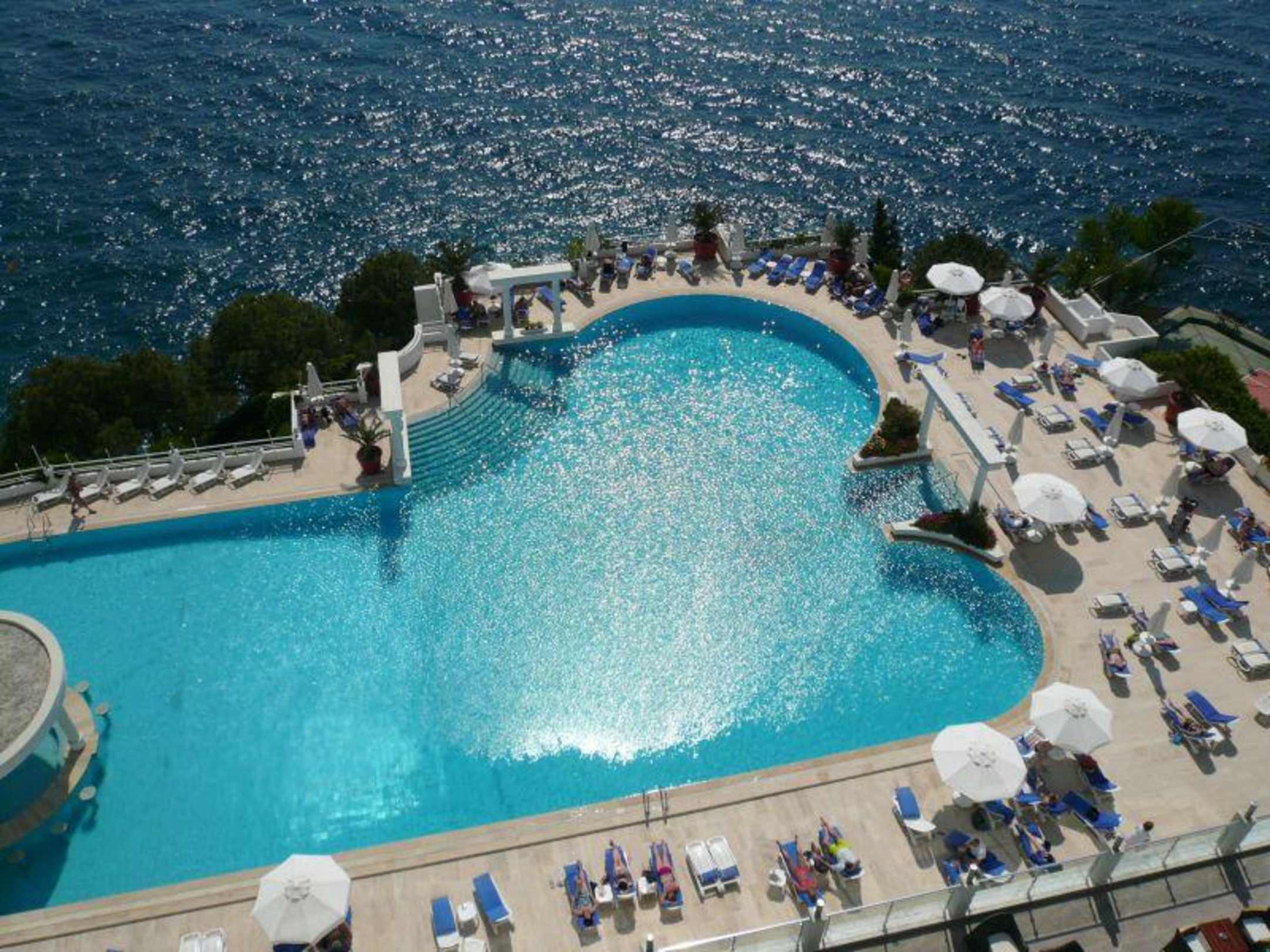 Blick von unserem Zimmer auf Pool und Meer.