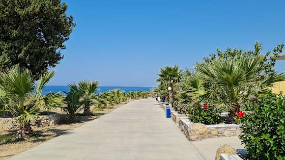 Der Weg zum Strand. Wenn man gemächlich geht, ist man in 5 Min. am Strand. Ist man schlecht zu Fuß unterwegs, so kann man auch mit einem offenem Wagen hingefahren werden.