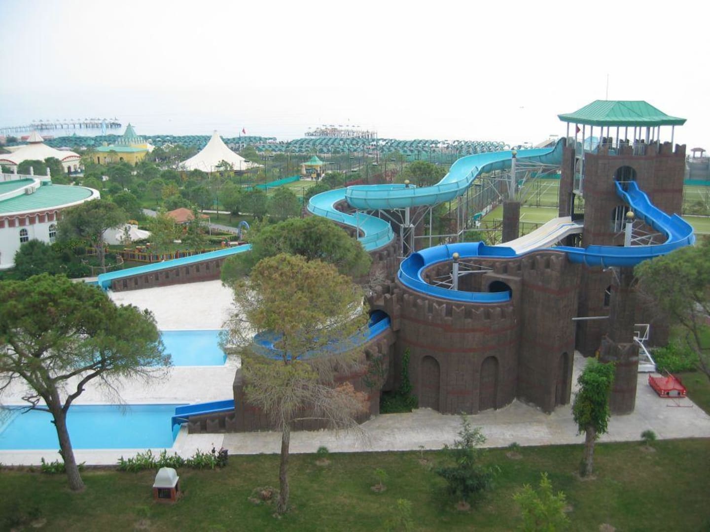 Blick vom Wohnkomplex auf sehr schöne und gepflegte Wasserrutschen.