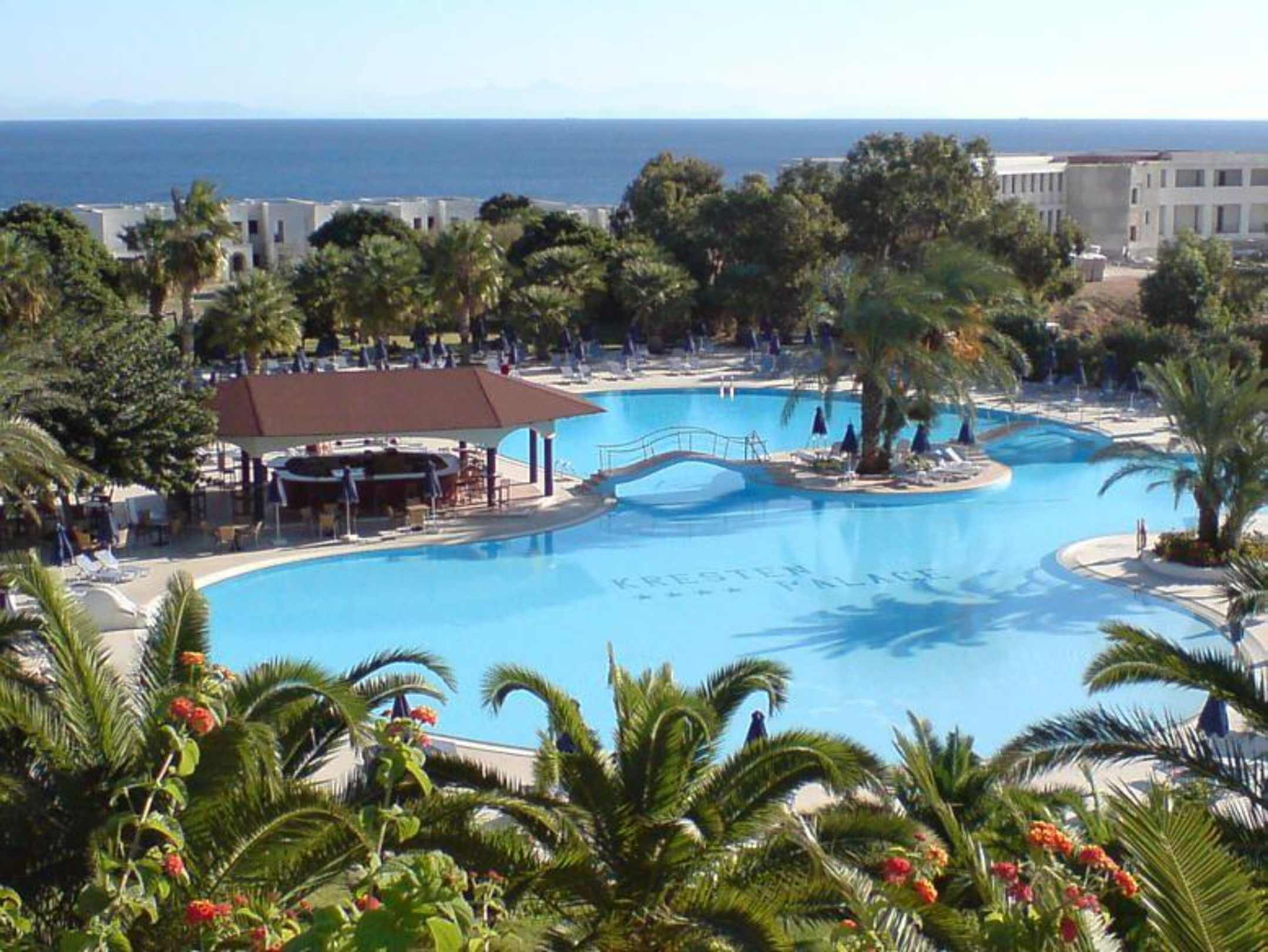 Blick von der Sonnenterrasse auf den Hotelpool. Im Hintergrund Richtung Meer erkennt man die Neubauten, die künftig das Areal meerwärts verstellen werden.