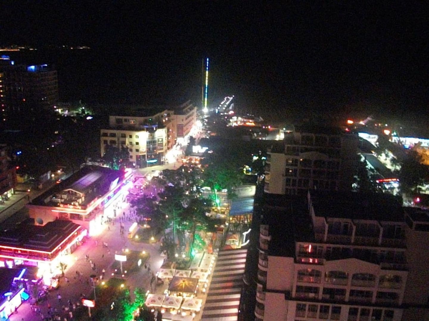 Man sieht die Straße, die zum Strand führt, die Nachts zu einem kleinen Lichtermeer erwacht.Außerdem im Bild: Hinten am Meer eine Bungeekugel und einen kleinen Steg.