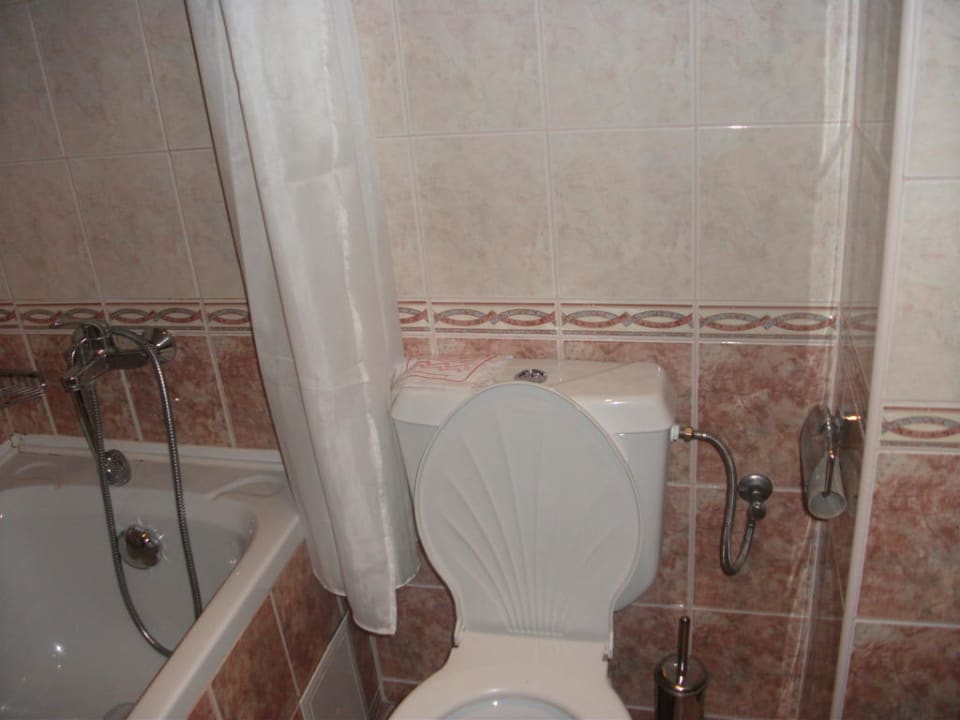 Hier wagen wir einen kleinen Blick in das etwas kleine (aber ausreichende) Bad eines Doppelzimmers. Wie man sieht ist sogar eine Badewanne vorhanden.