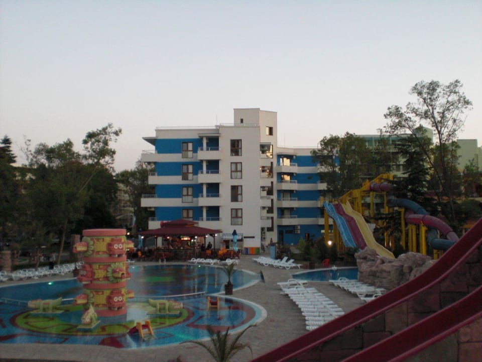 Blick auf den Pool und einen Teil der Rutschen