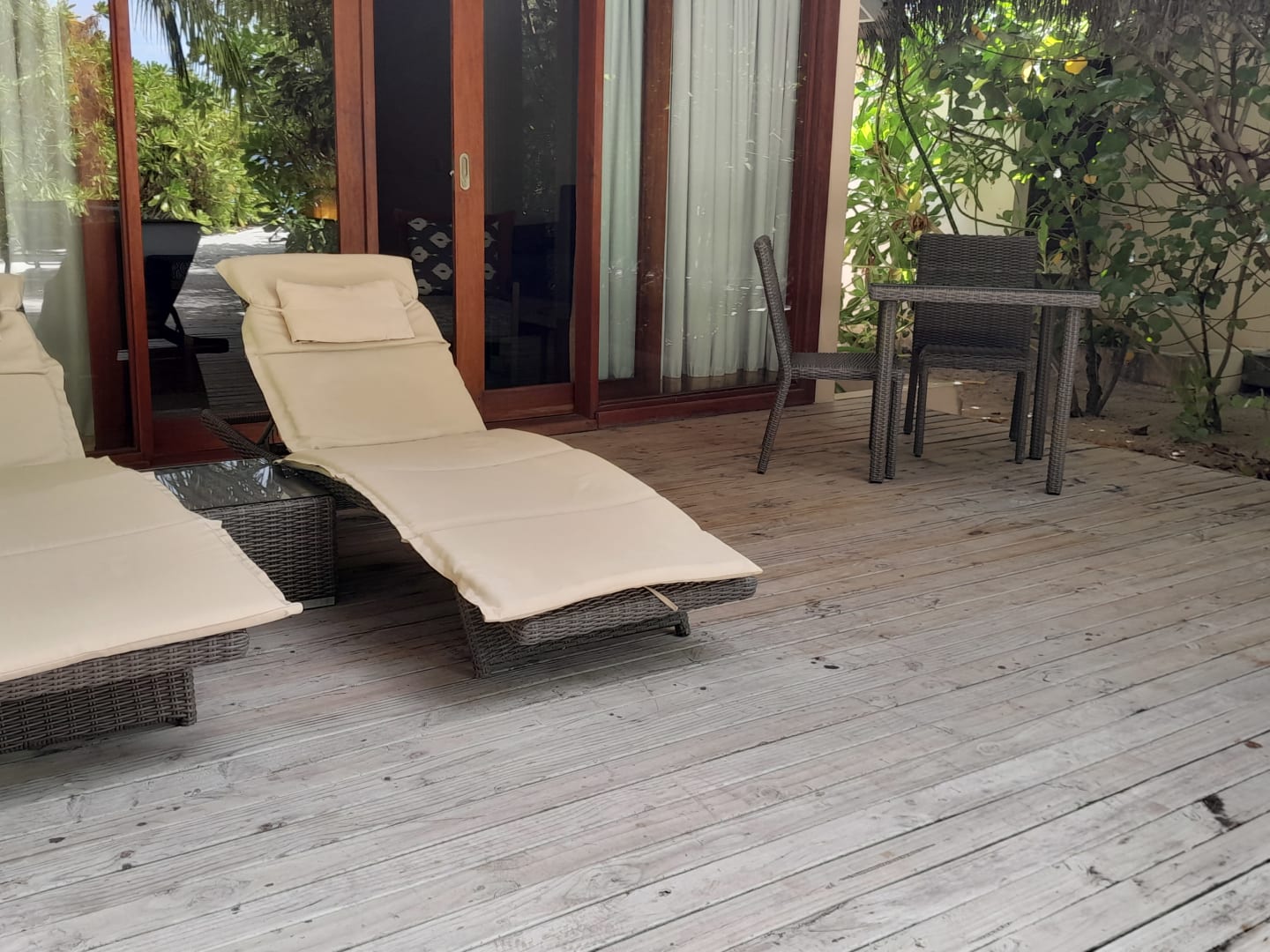 Terrasse mit den 2 Liegen und Tisch mit Stühlen