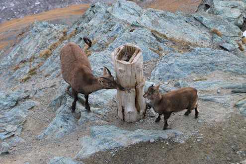 Steingeiss mit Jungem am Salzstock unmittelbar unterhalb des Kulmhotels.