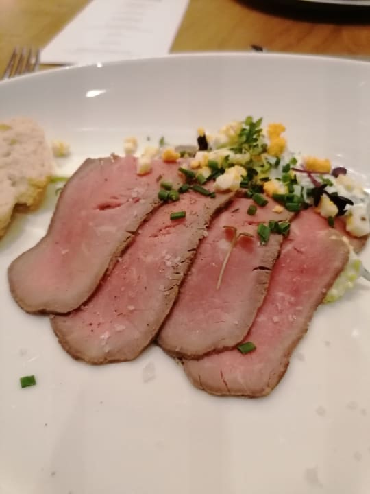 Roastbeef mit Lauchsalat, grüner Soße und Ei.
