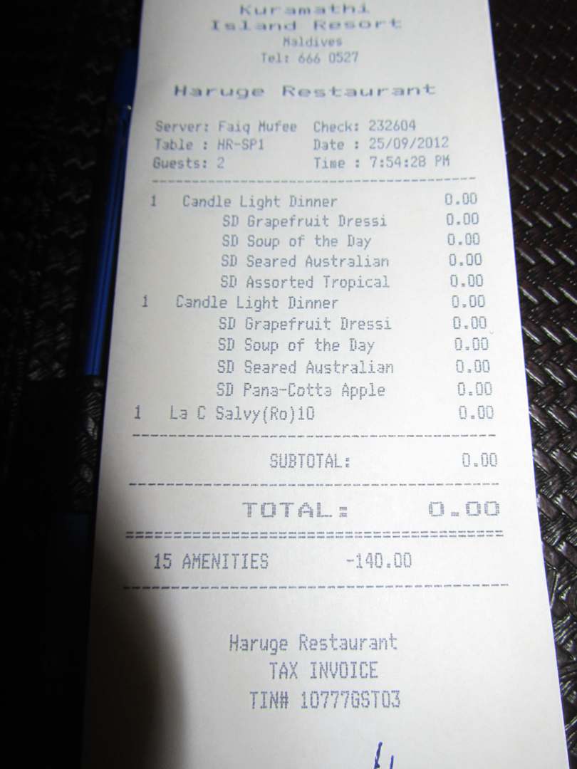 KassenbonSo sehen die Kassenbon aus, die man immer unterschreiben muss (statt Armbändchen). Sie stehen immer auf Null, aber darunter kann man den eig. betrag sehen, was es gekostet hätte.... Dieser Bon ist von unserem Candel-Light-Dinner. Getränke sind immer im All-In (bei Basic 90%). auch in den Al a carte-restaurants.