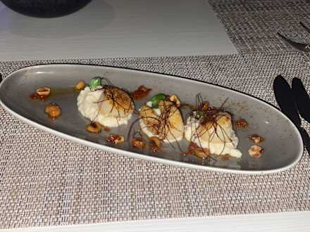Vorspeise im Reef: Jakobsmuscheln auf Blumenkohlpüree und mit Haselnuss Vinaigrette