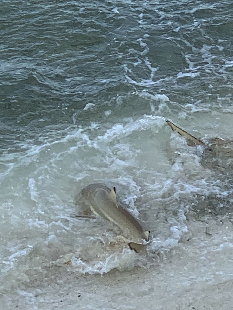 direkt vor unserem Schlafzimmer aus Haie auf Fang nach den kleinen Fischen