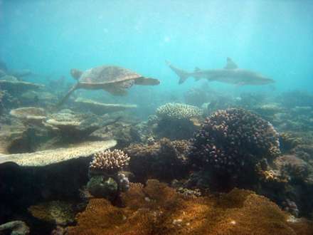 Echte Karettschildkröte und Schwarzspitzen Riffhai