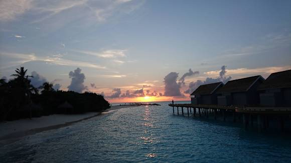 Blick vom neuen Bereich waterpoolvilla Steg auf die Sandbank beim Sonnenuntergang