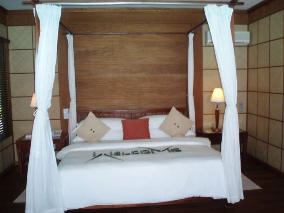 Das Bett im Wasserbungalow.