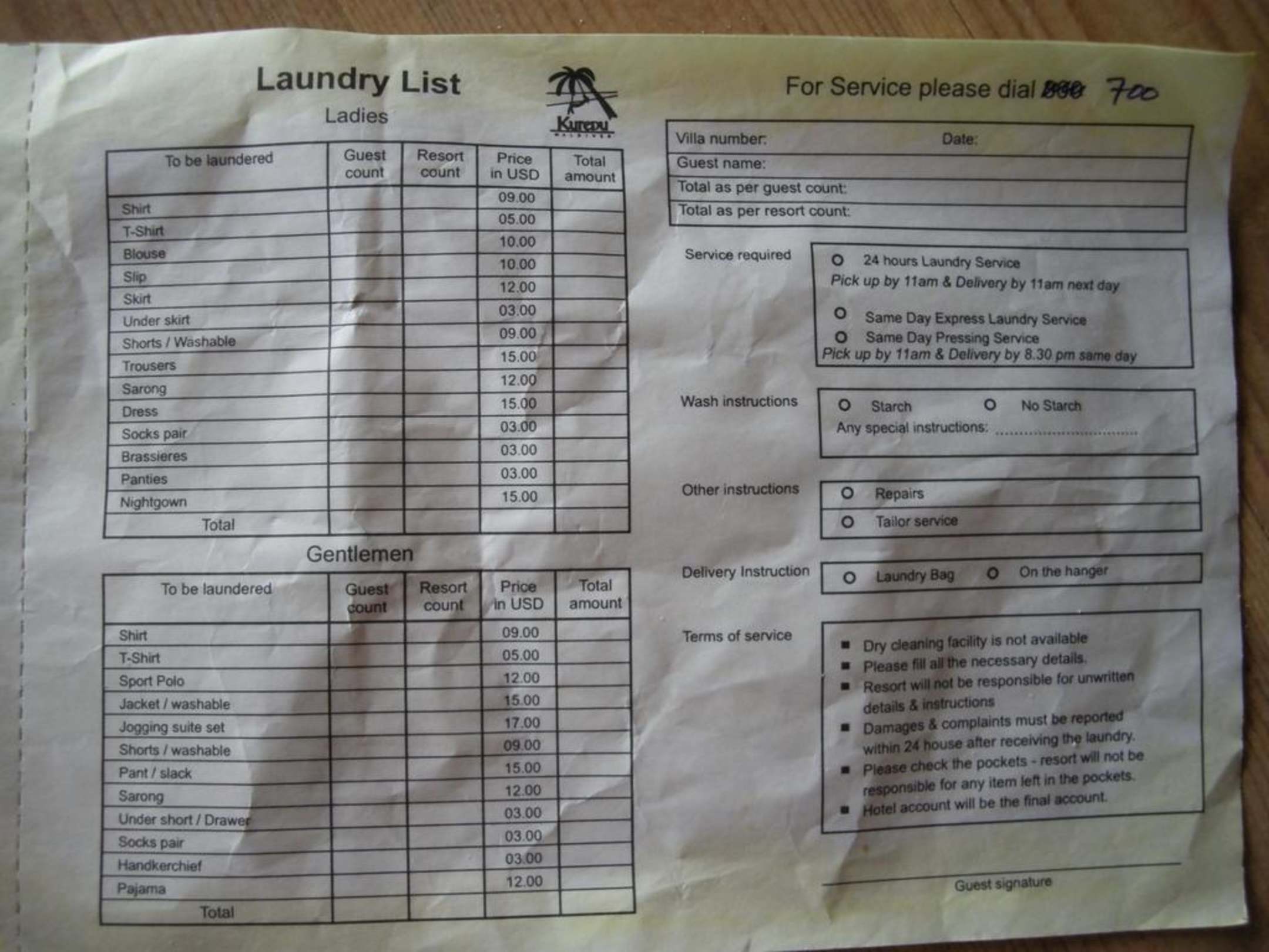 Preisliste für Reinigung Wäsche auf Kuredu Island