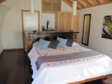 Die Einrichtung der Beach Villa Zimmer ist sehr angenehm und macht einfach Lust auf Urlaub. Das Badezimmer liegt nach hinten offen im Aussenbereich.