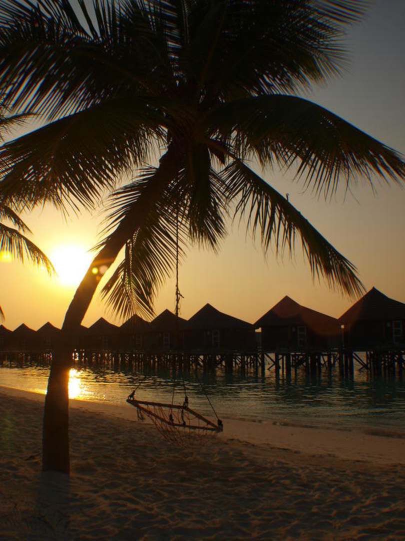 Wasserbungalows bei Sonnenuntergang