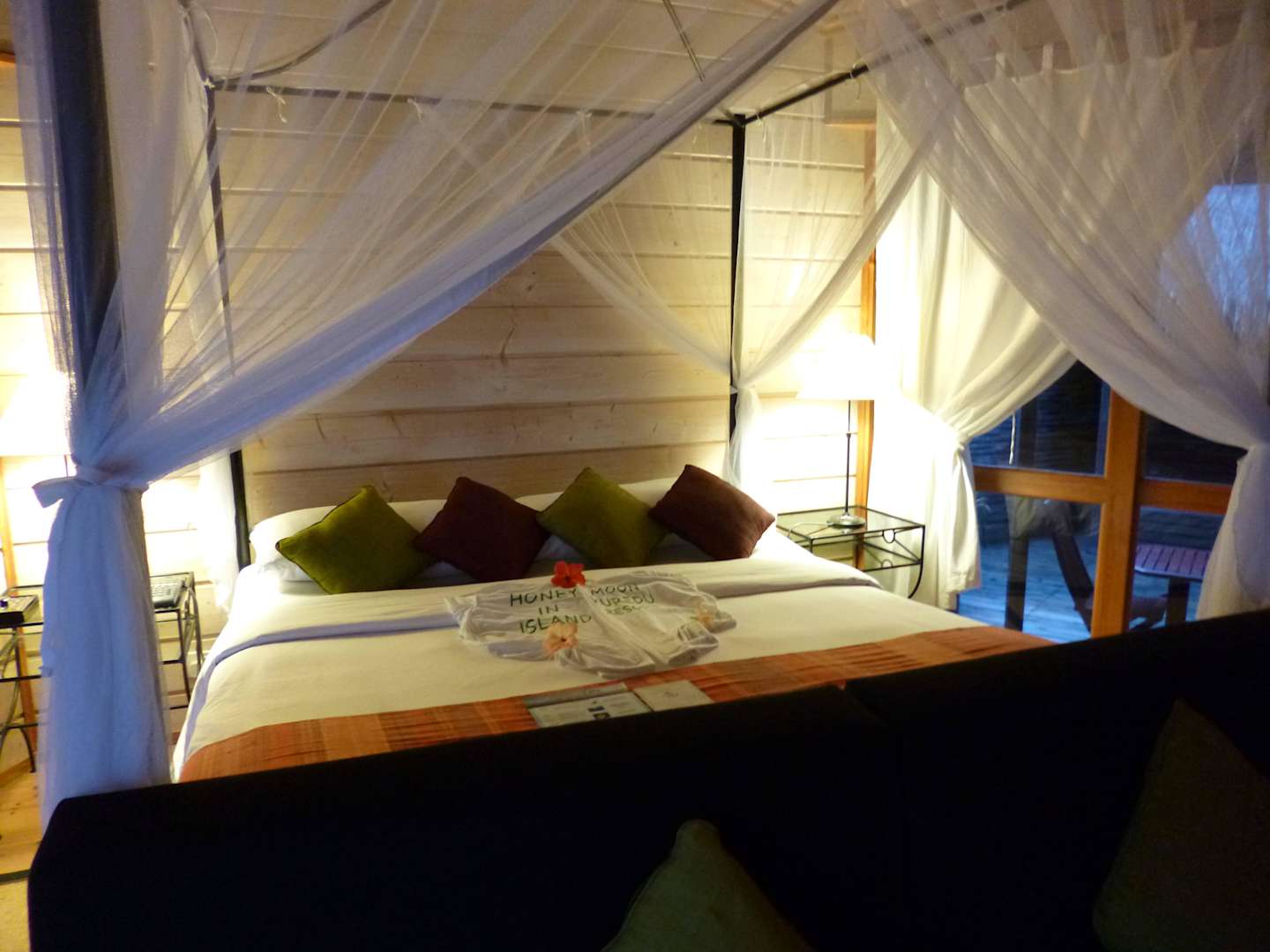 Bett mit Willkommensgeschenk zum Honeymoon