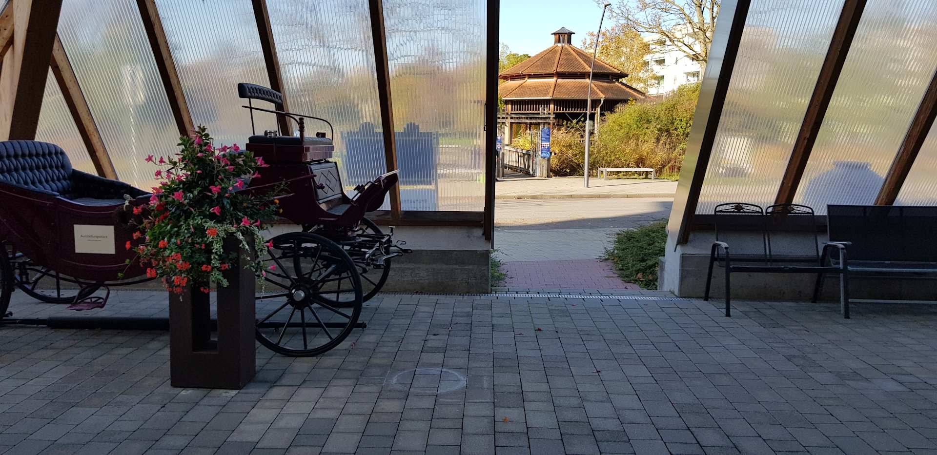 Blick vom Hoteleingangsbereich Richtung Kurpark auf das Gradierwerk