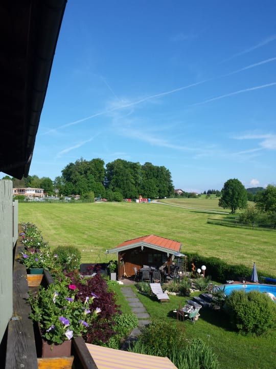 Ausblick vom Balkon. Im Hintergrund sieht man die Therme