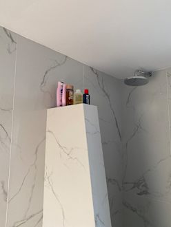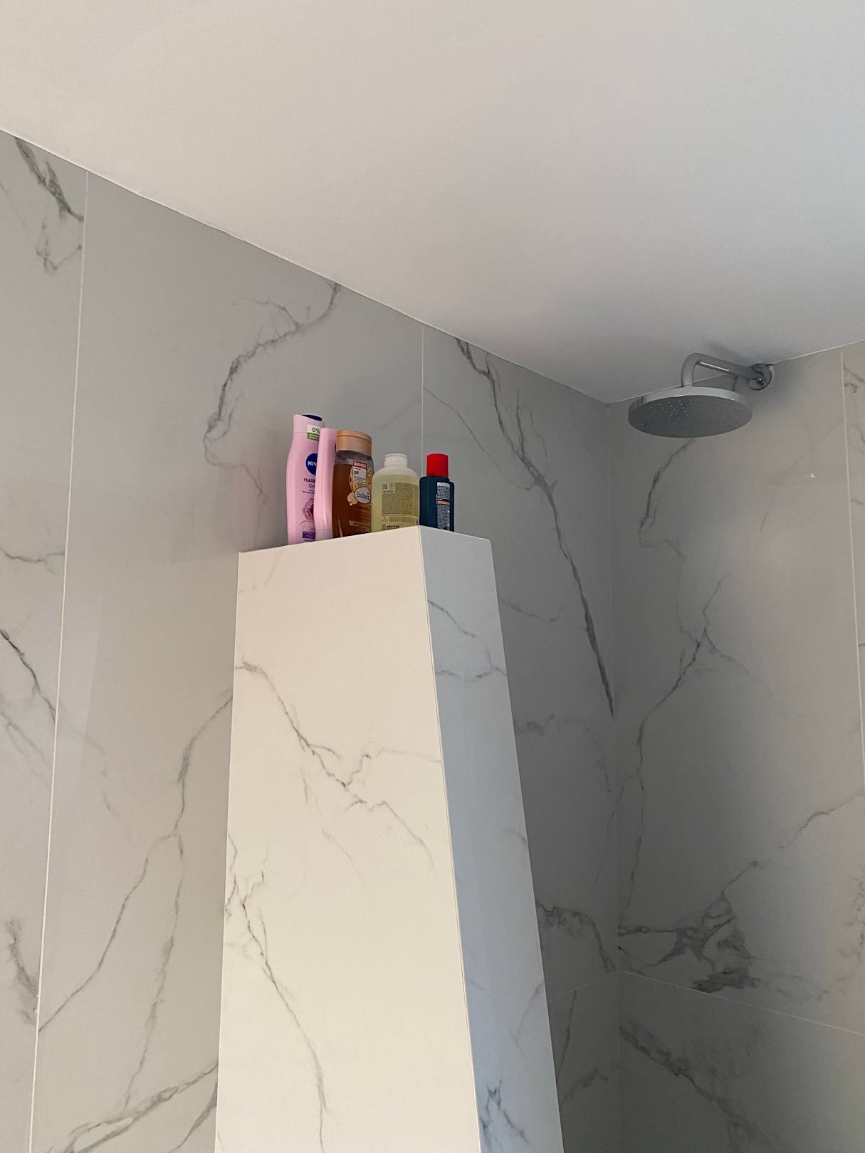 Da auch in der Dusche keine Ablagen - stehen Shampoo + Duschgel auf der Dusche