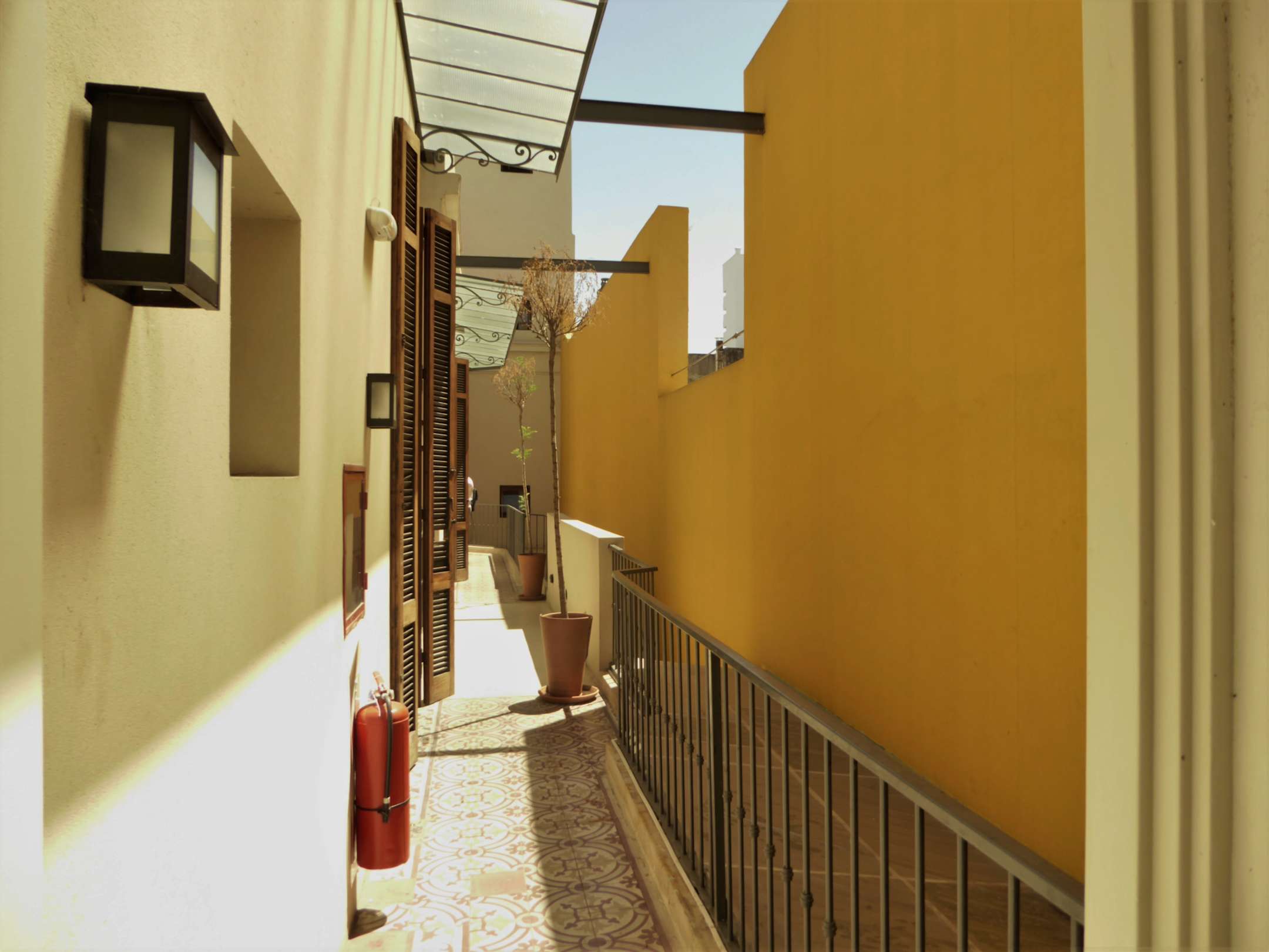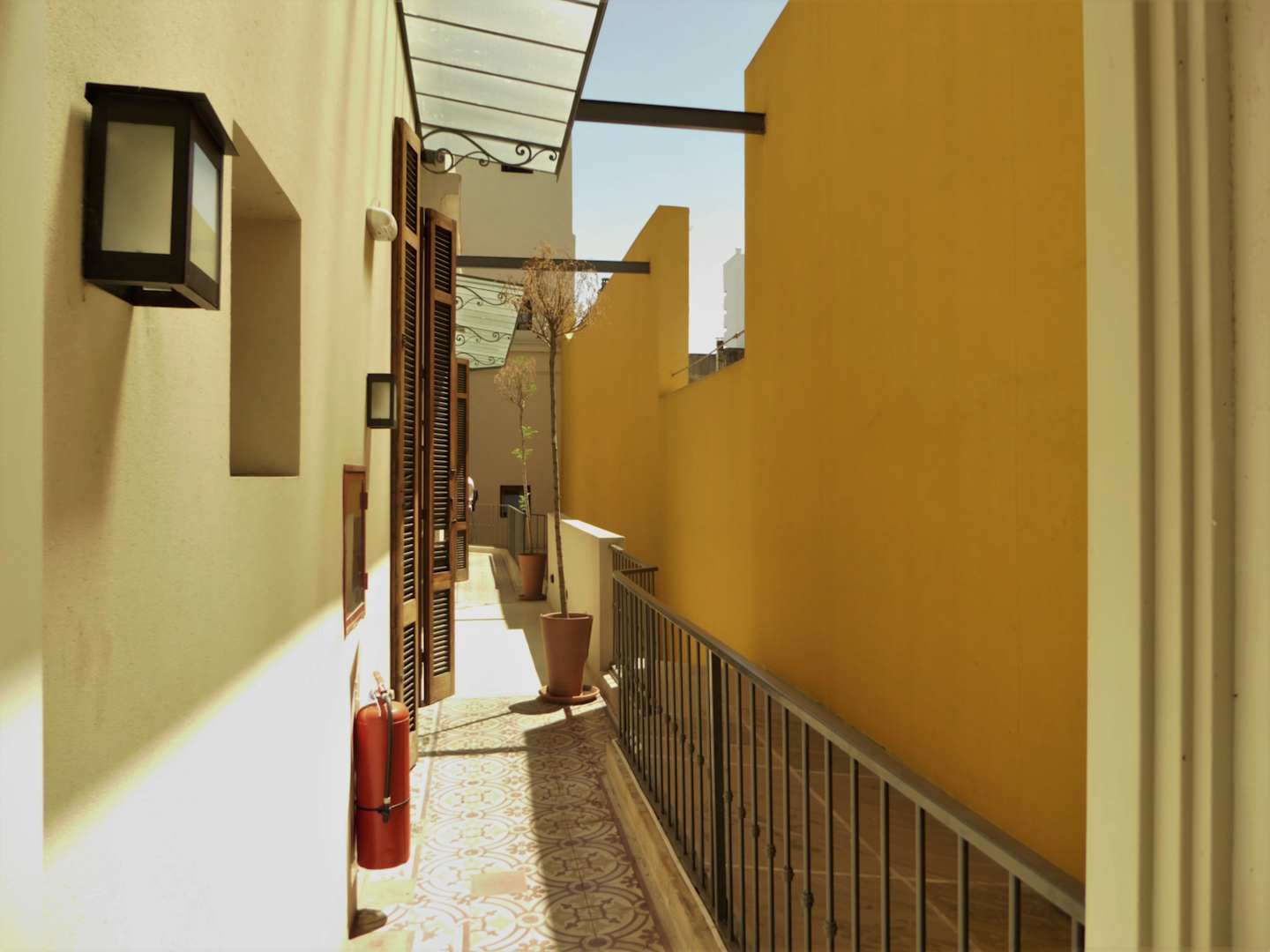 halb überdachter Gang, über den das Zimmer zu erreichen ist (1. Stock)