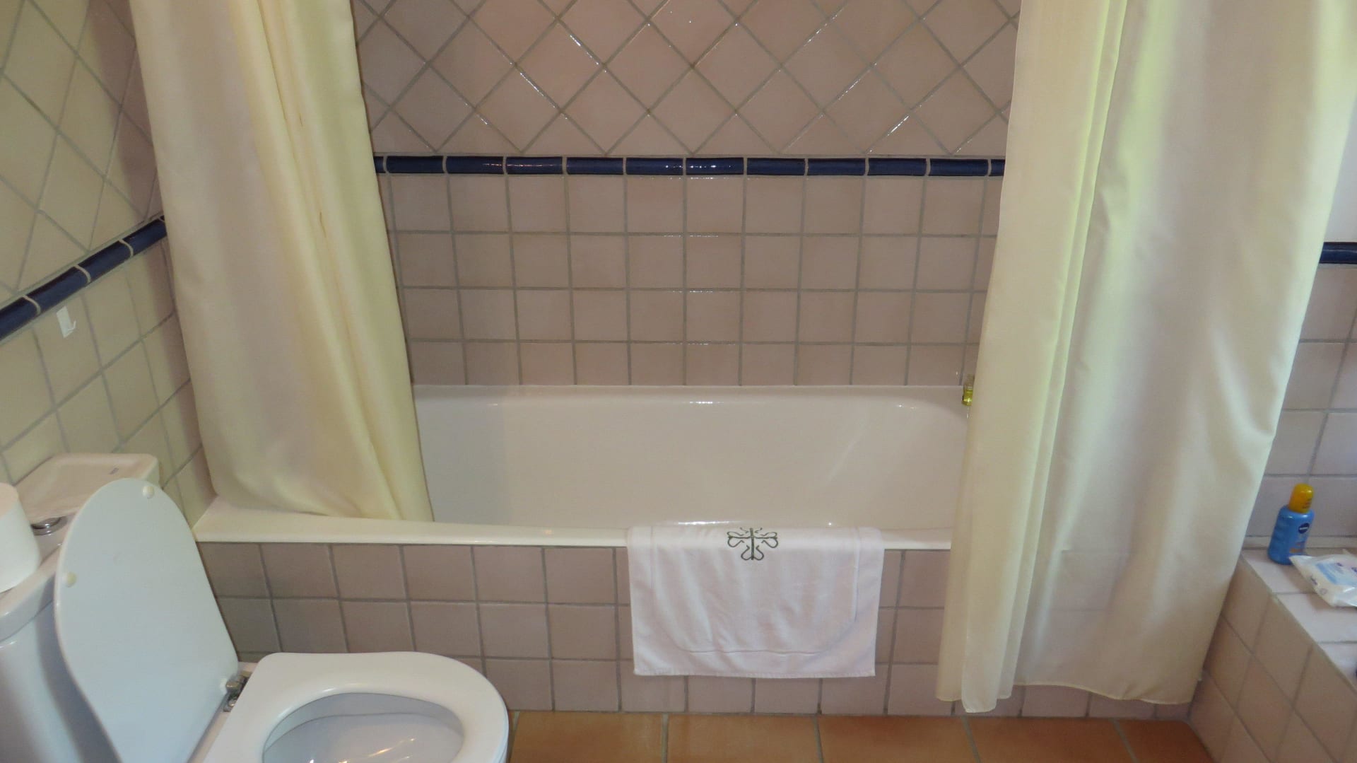 Enge Badewanne mit muffigem Duschvorhang