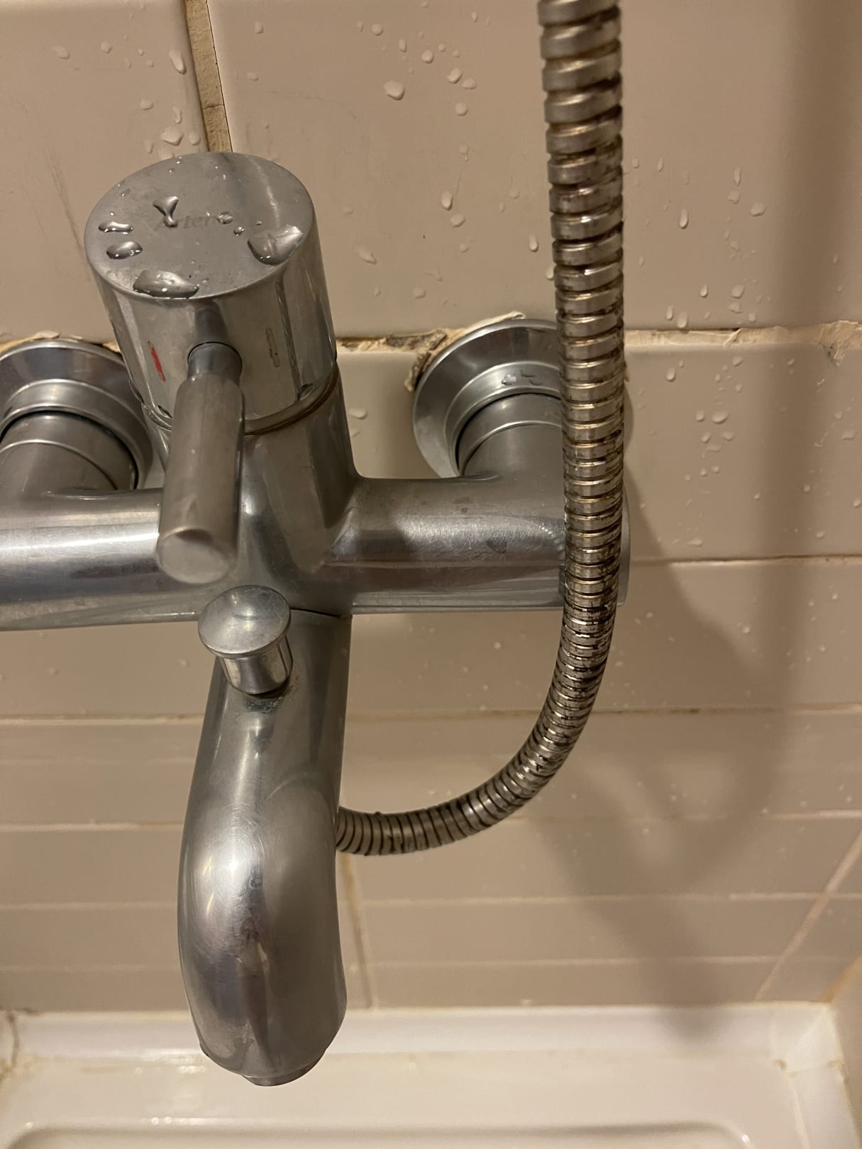 DreckIge und veraltete Armaturen sowie Duschkopf und Flex-Schlauch.