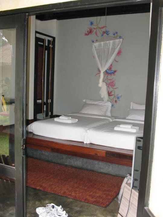 Blick in den Bungalow mit erhöhtem Bett