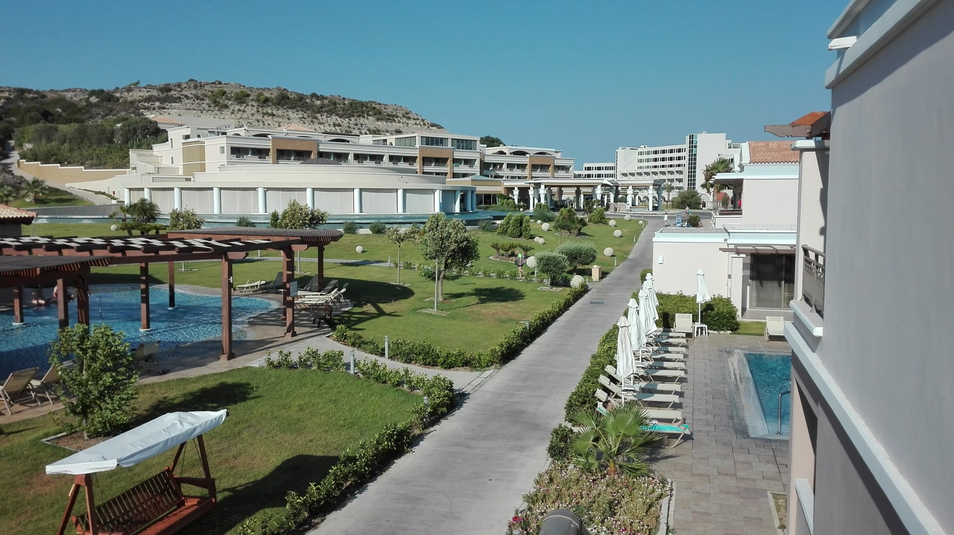 Blick von einem der Wohnhäuser auf das Hauptgebäude, indem sich Lobby, Shops, Speisesaal, Bars und natürlich Gästezimmer befinden und vieles mehr...
