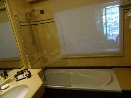 Blick vom Badezimmer zum Pool