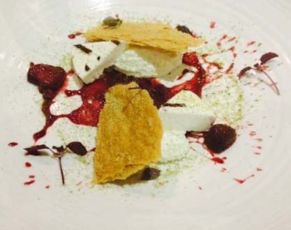 RestaurantZwischengang im französischen Restaurant L'Etoile: Käsetarte mit Früchten und Pistazienstaub.