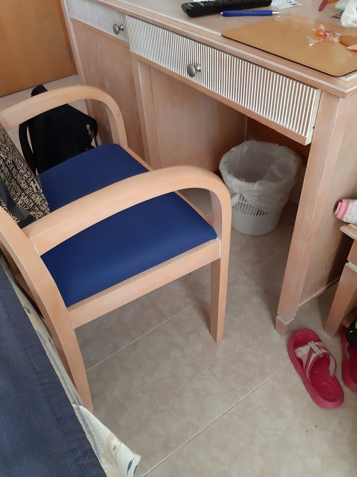 Zimmer 515: Antwort... Die Lehnen des Stuhls verklemmen sich unter der Schublade des Tisches. Vor und Zurückziehen nur mit Kraftaufwand möglich. Hinsetzen trotzdem nicht möglich, da Rückenlehne und Fußende vom Bett zuwenig Platz lassen.