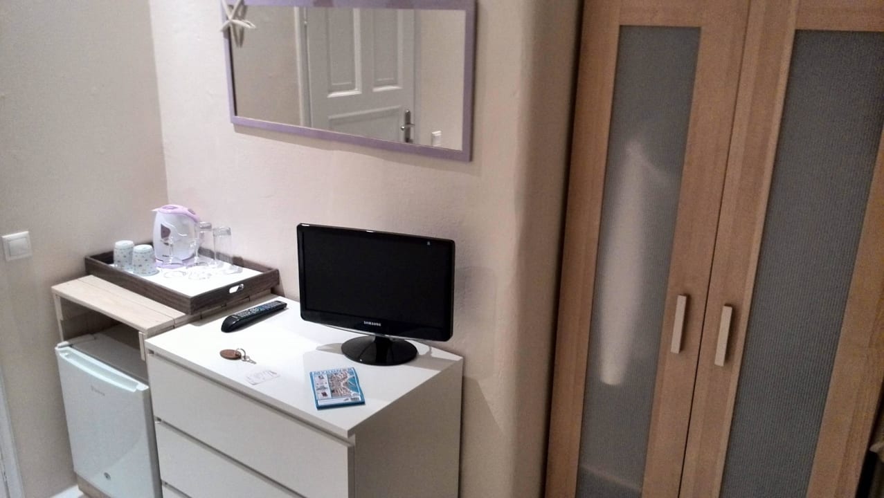 Kühlschrank, Kommode mit TV und Kleiderschrank
