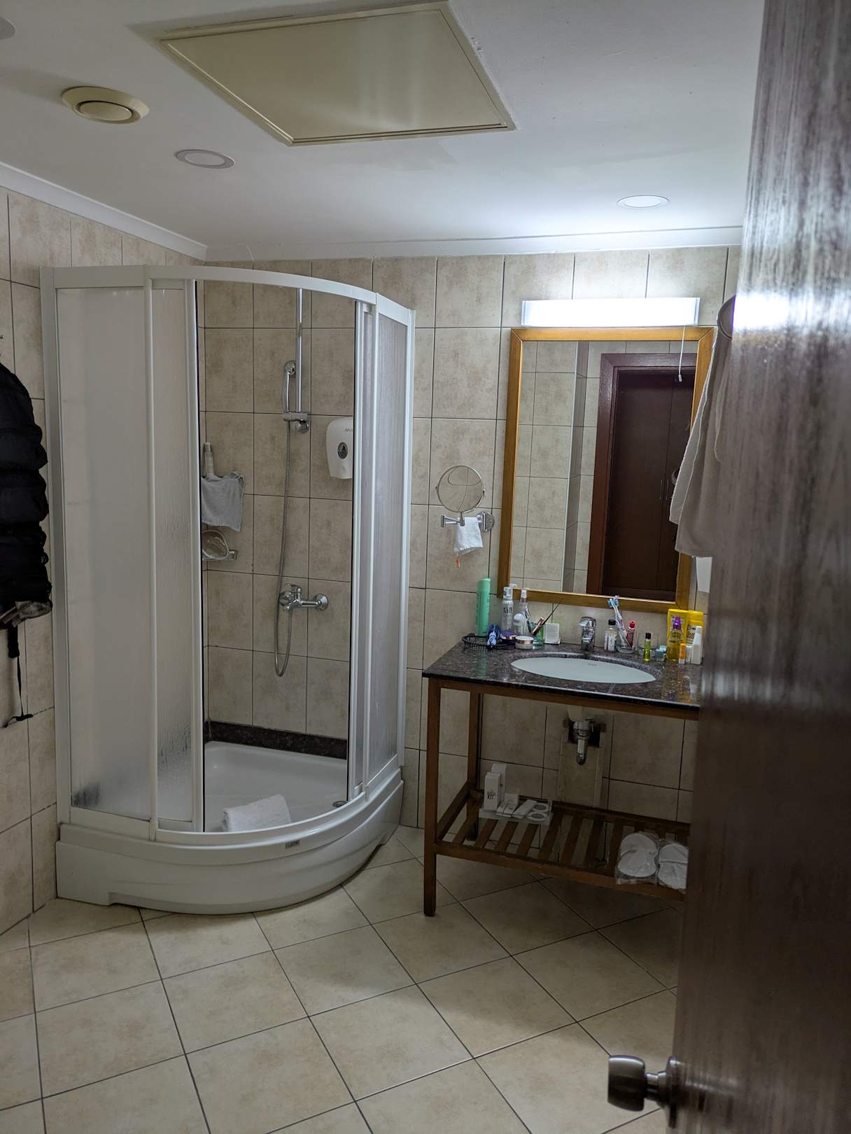 großes Badezimmer mit ziemlich kleiner Dusche und wenig Ablagemöglichkeiten