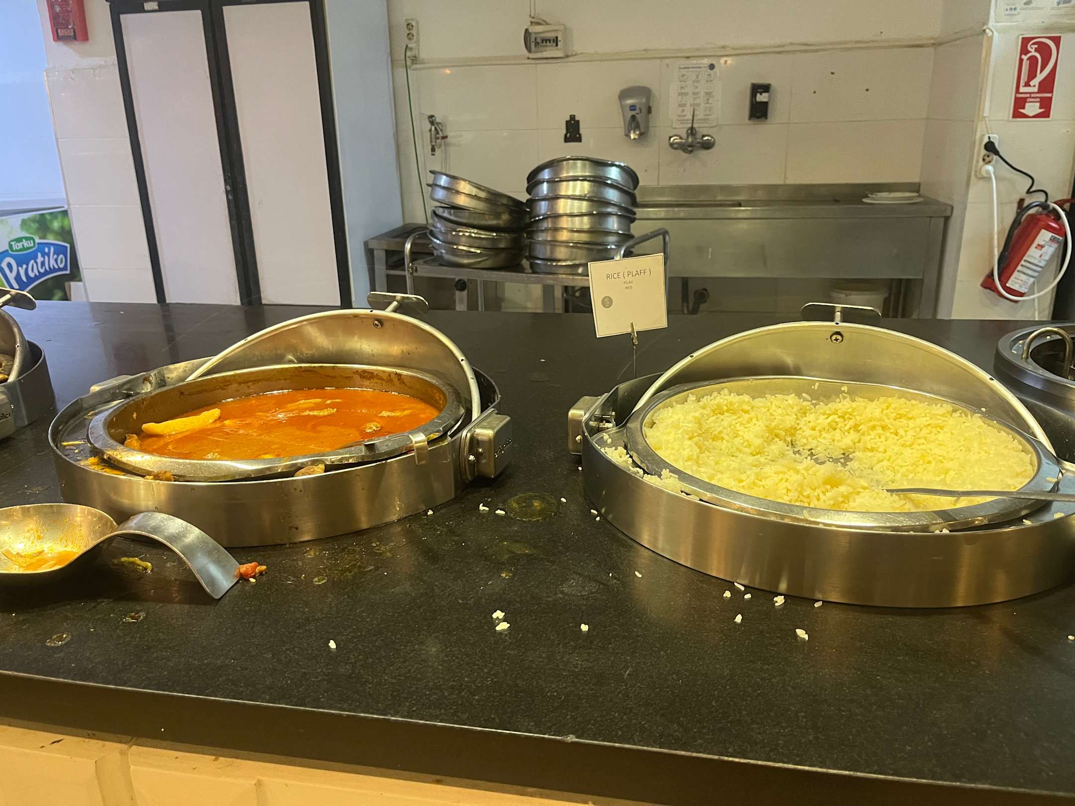 Zwischendurch macht niemand sauber beim Buffet. Alles dreckig, unappetitlich, kalt.