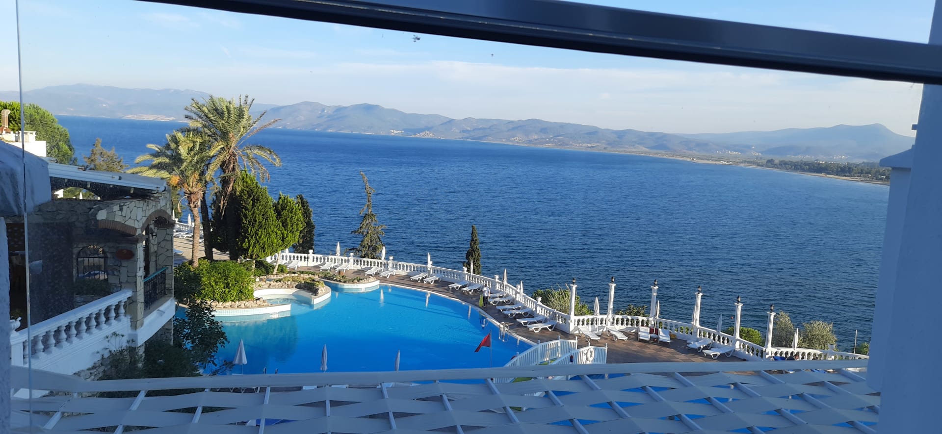 Blick vom Balkon über den Pool auf Meer