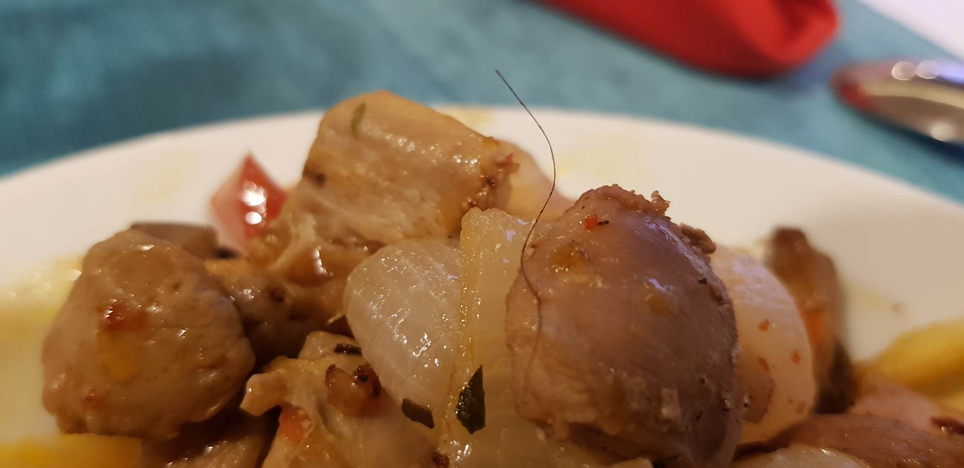 Haare Im essen vom Chefkoch mit Schwarzem Haaren der behauptet das es ein gefärbtes Haar wäre und nicht von ihm obwohl er die selbe Haarfarbe und Länge hat .