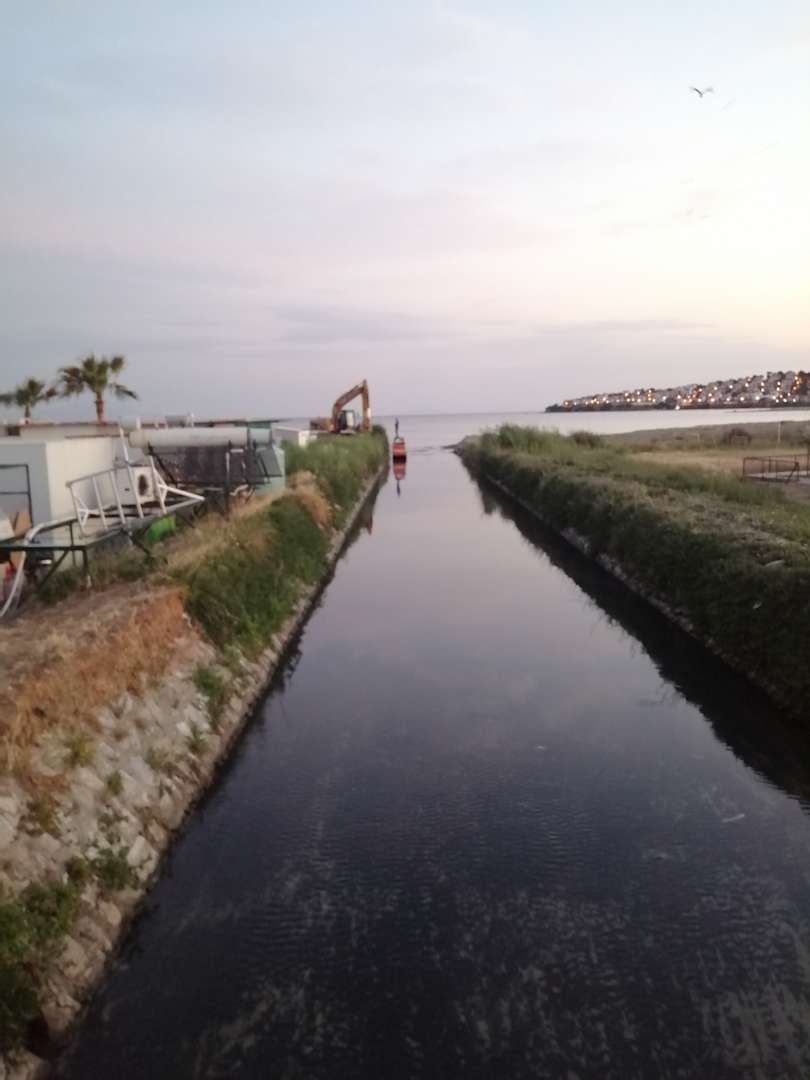Stinkende Kanal durd Grundstück von Hotel, neben Restaurant und Toilette ins Meer