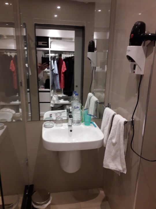 Badezimmer mit Dusche, Waschbecken, Haartrockner und WC