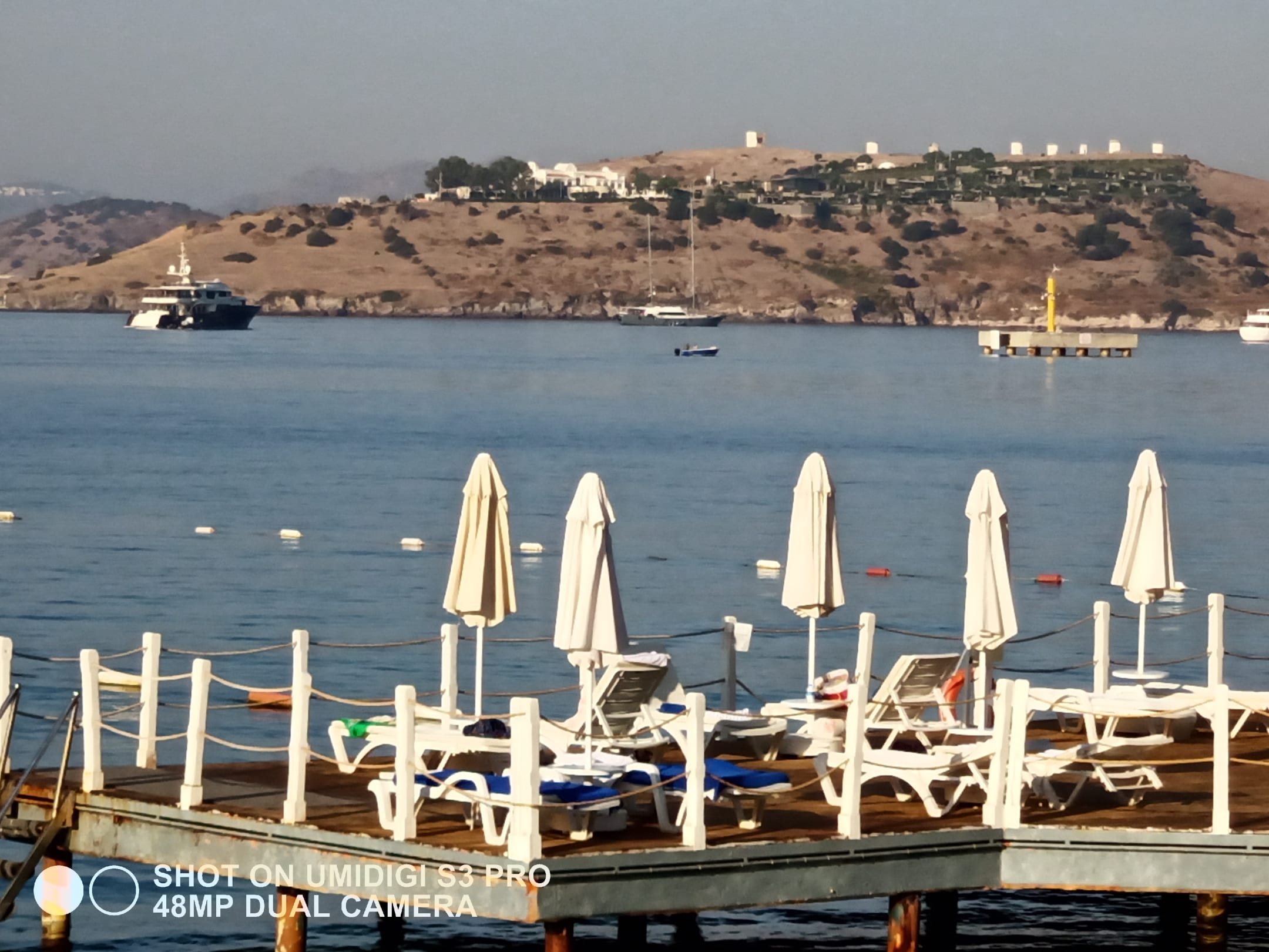 StrandBadesteg des Hotels, Blick Richtung Windmühlen
