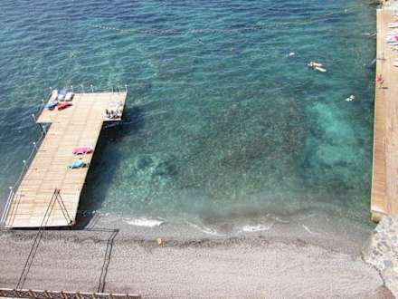 Steg, klares Wasser, rechter Strand (Holz/Beton)