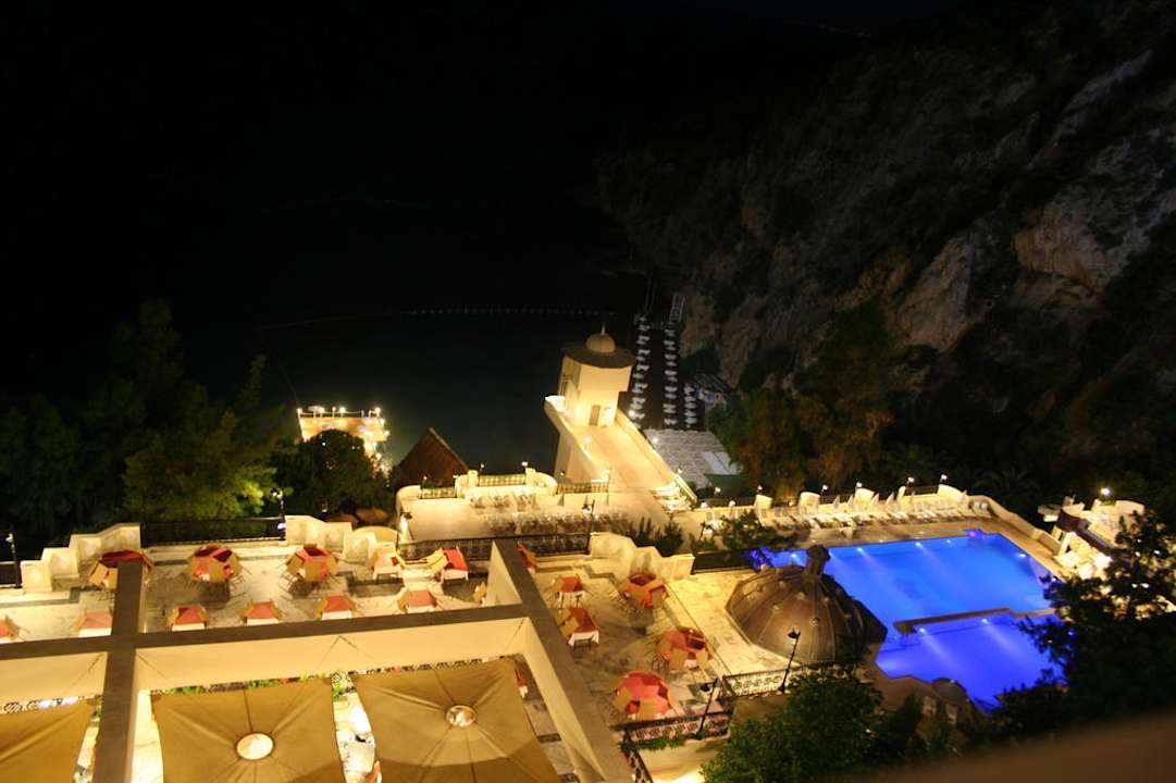 Blick auf den Pool und Restaurant bei Nacht