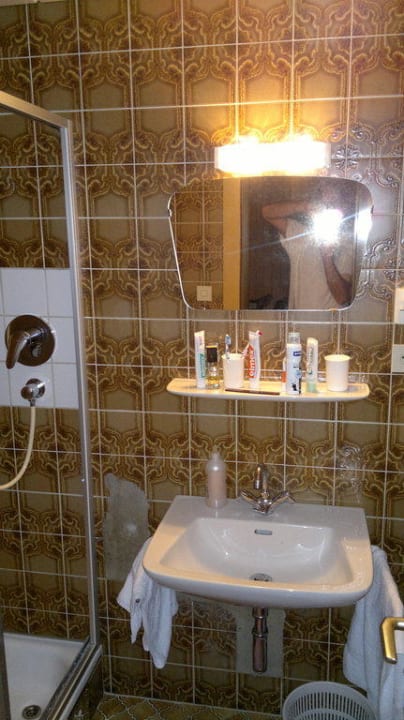 BadezimmerAlte und unmoderne Einrichtung des Bades mit schlecht ausgebesserten Wandkacheln. Für diese Hotelkategorie unmöglich!