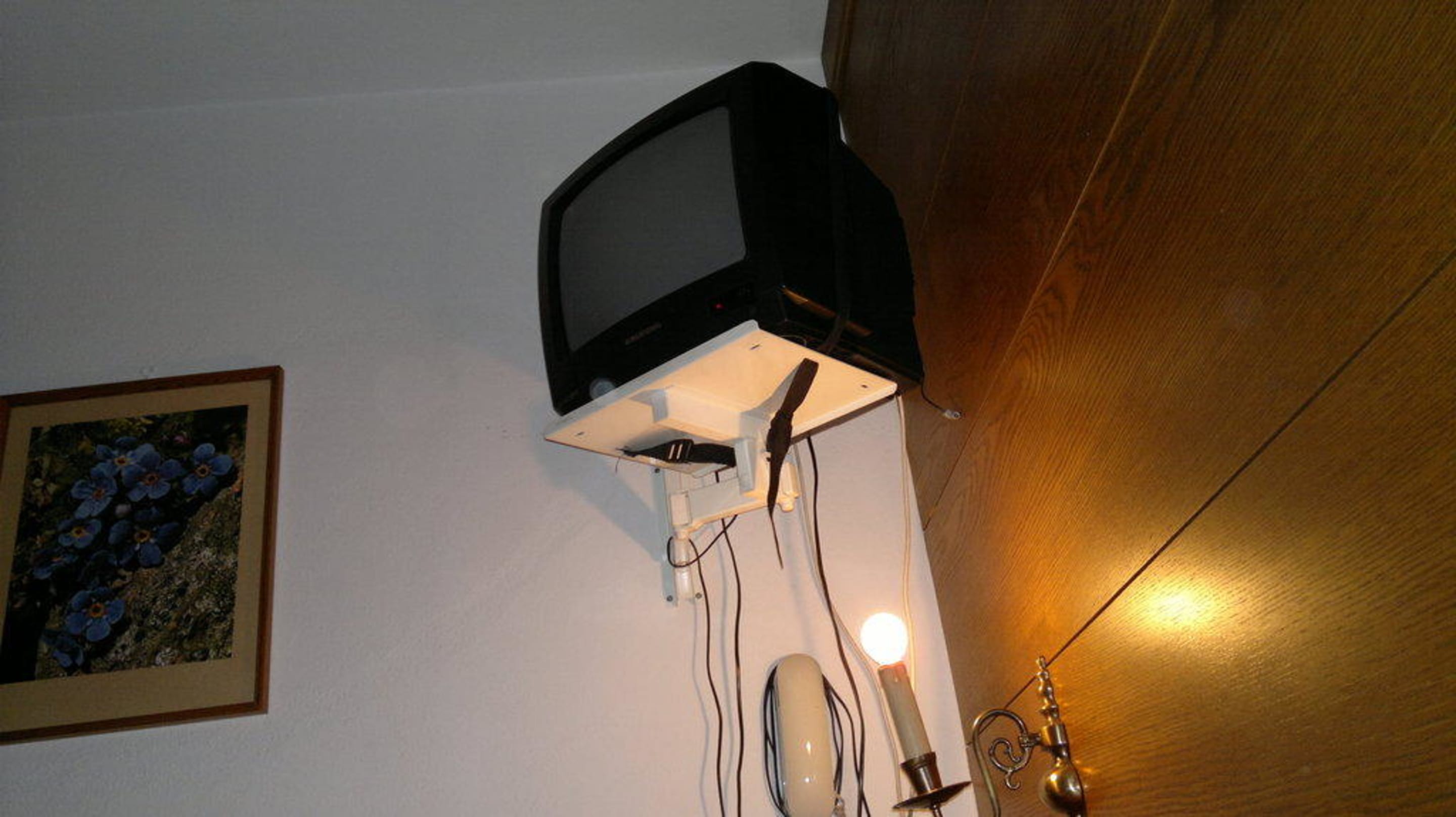 Der alte Fernseher ist über dem Kopfteil des Bettes in der Ecke des Zimmers angebracht. Ein Fernsehen vom Bett aus ist so unmöglich, abgesehen von der kleinen Bildgröße (ca. 38 cm Diagonale).