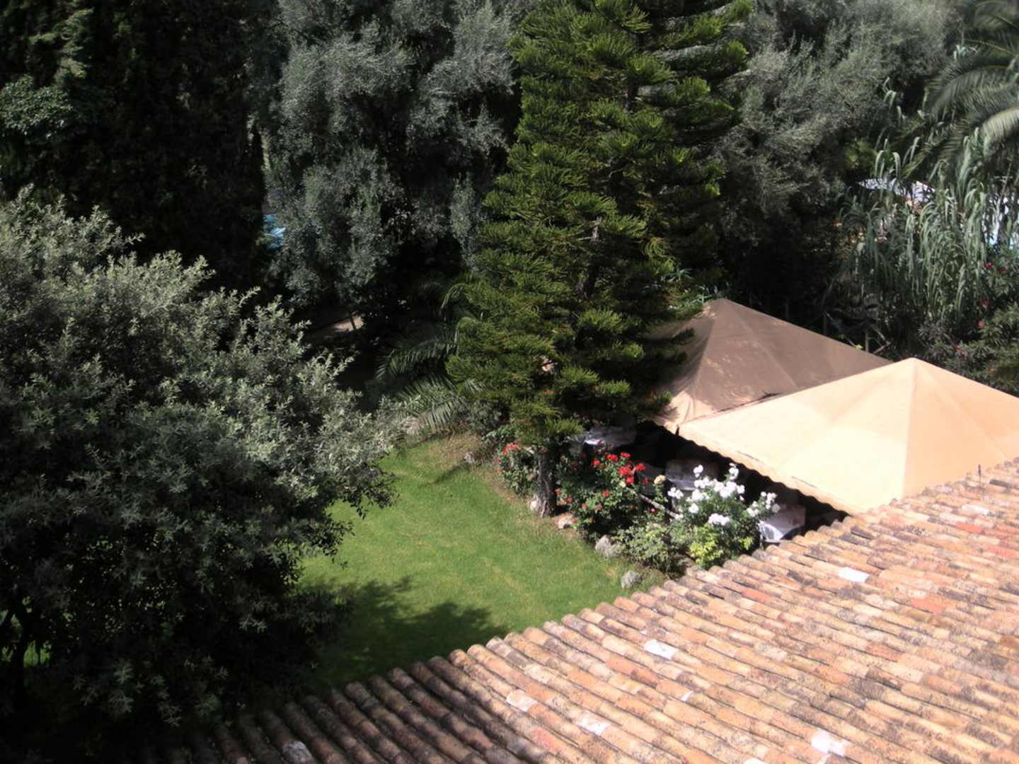 Blick in Garten und Restaurant