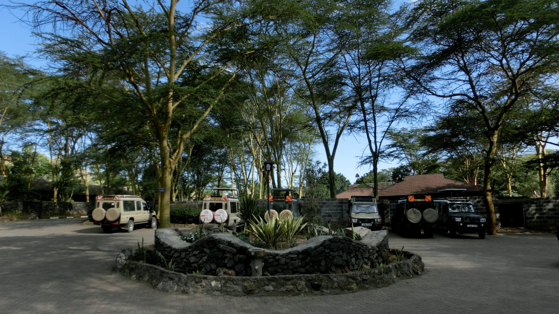 Parkplatz für die Safarifahrzeuge vor der Lodge